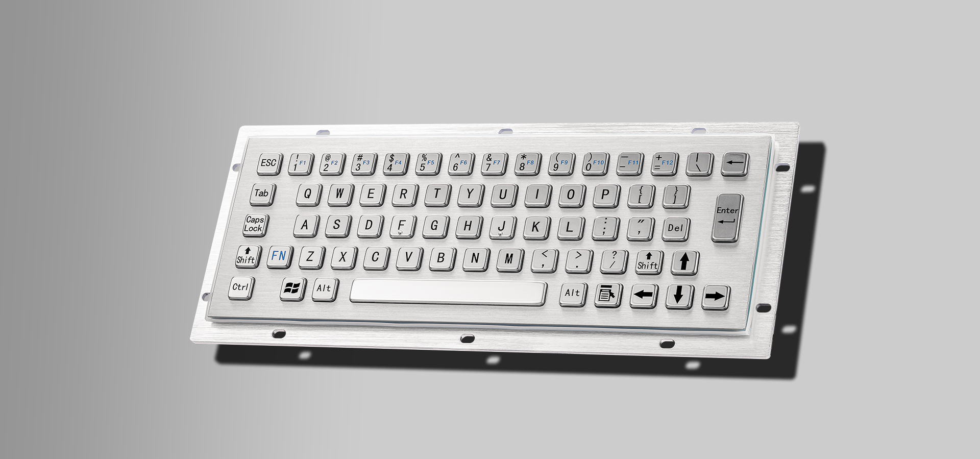 IP65嵌入式工业键盘,上嵌入式安装方式67键紧凑布局,如F1-F12功能键需+FN组合键使用,内置电路采用工业级标准沉金PCB板。