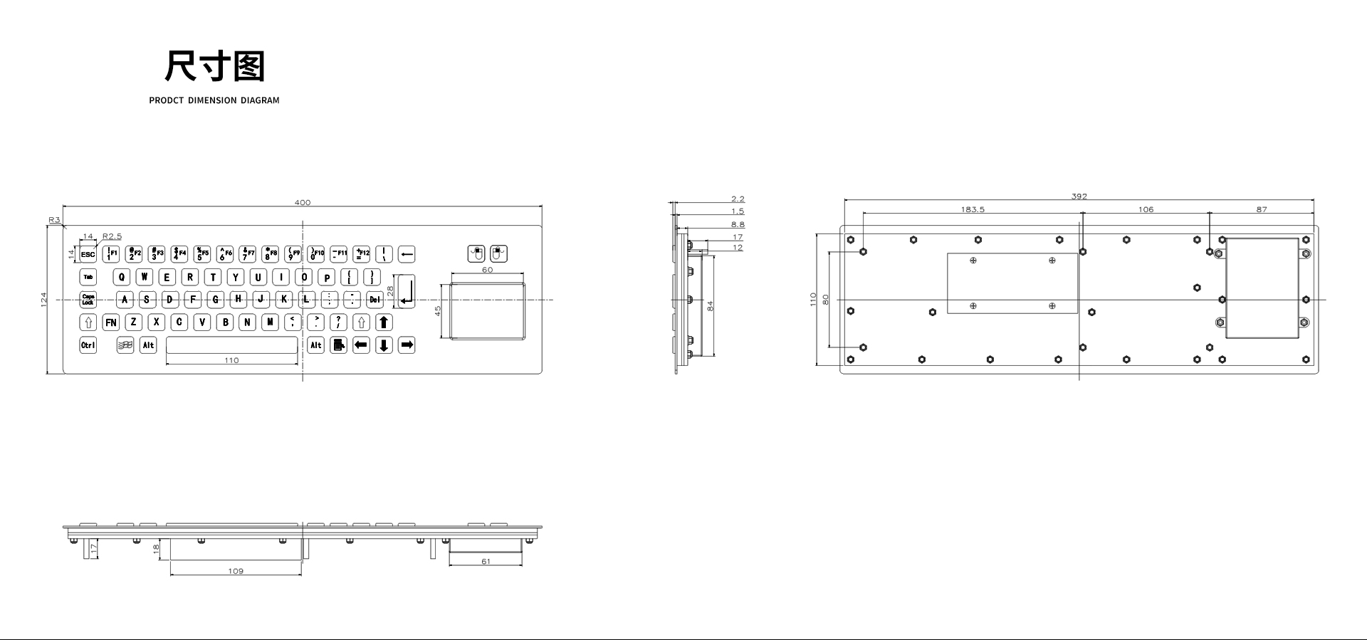 IP65嵌入式触摸板工业键盘,下嵌入式安装方式,67键带触摸板紧凑布局,触摸板分辨率: 800dpi可进行精准快速光标定位,如F1-F12功能键需+FN组合键使用,内置电路采用工业级标准沉金PCB板。