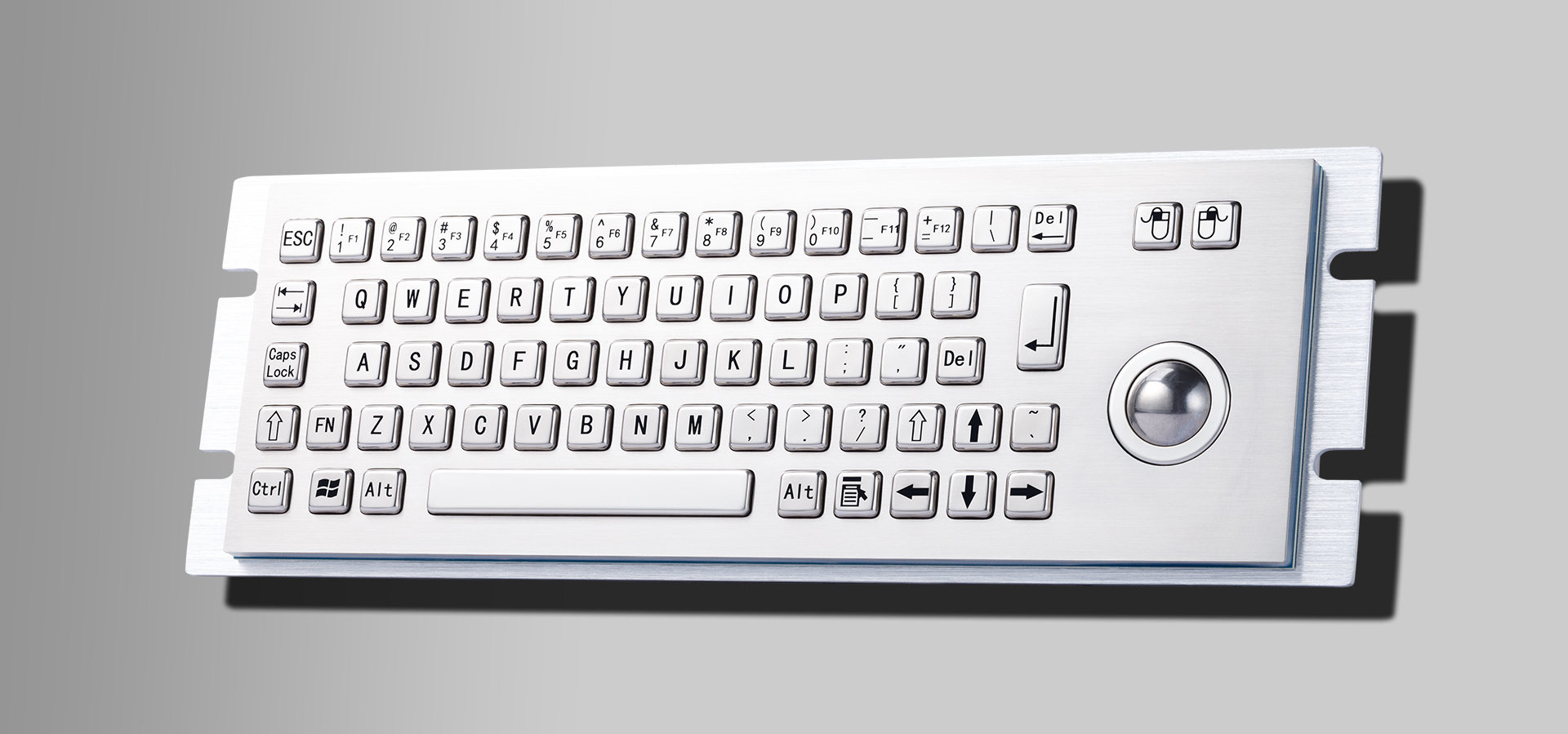 IP65嵌入式带触摸板工业键盘,上嵌入式安装方式67键紧凑布局,触摸板分辨率: 800dpi可进行精准快速光标定位,如F1-F12功能键需+FN组合键使用,内置电路采用工业级标准沉金PCB板。
