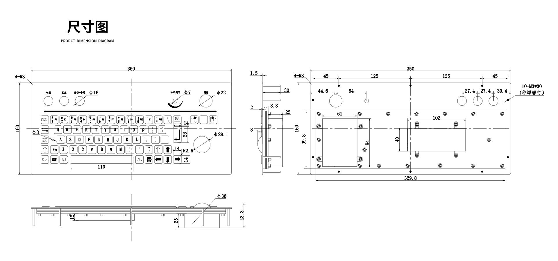 | 产品描述 | 定制面板带轨迹球专用键盘,布局预留客户其他集成安装孔,轨迹球配用直径36mm,300转/min可进行精准快速光标定位,如F1-F12功能键需+FN组合键使用,内置电路采用工业级标准沉金PCB板。 |
