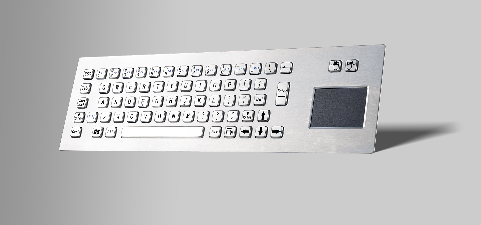 IP65嵌入式触摸板工业键盘,下嵌入式安装方式,67键带触摸板紧凑布局,触摸板分辨率: 800dpi可进行精准快速光标定位,如F1-F12功能键需+FN组合键使用,内置电路采用工业级标准沉金PCB板。