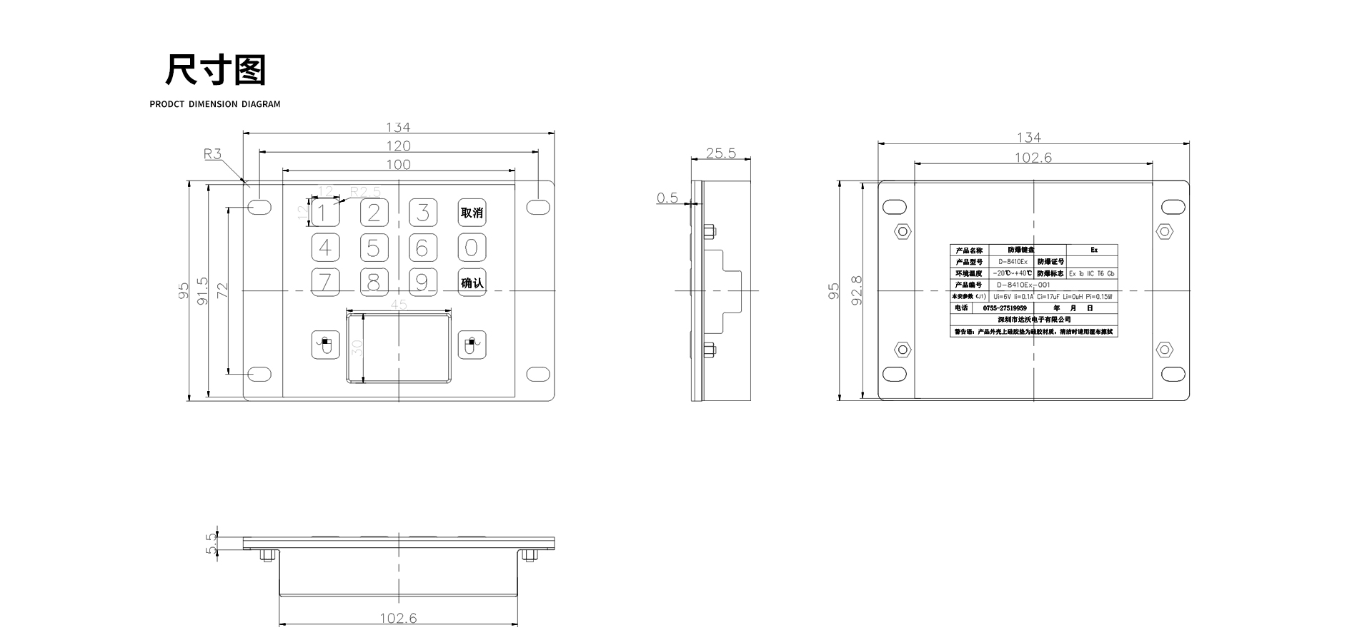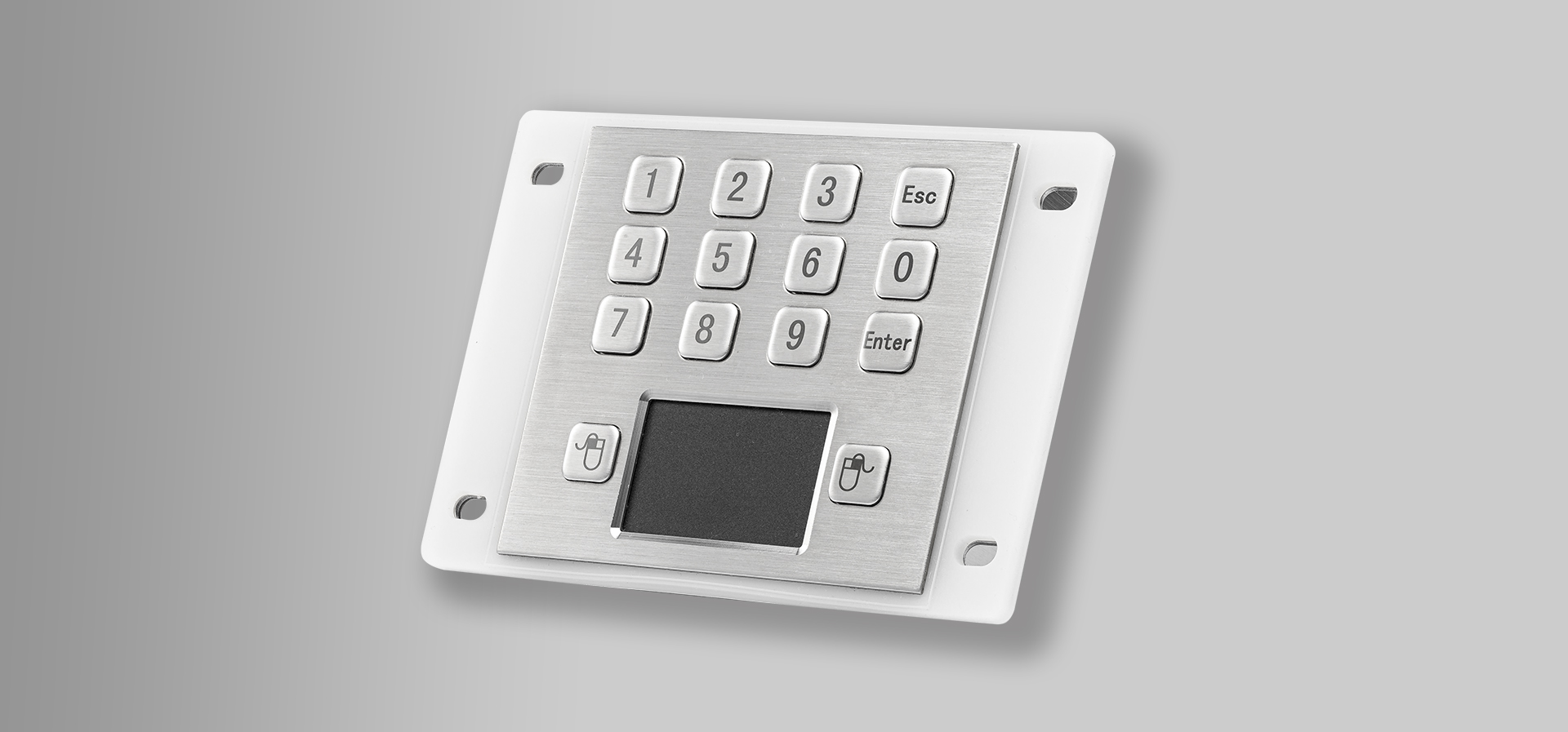 IP65嵌入式防爆键盘,上嵌入式安装方式,12个数字键带触摸板紧凑布局,触摸板分辨率: 800dpi可进行精准快速光标定位,内置电路采用工业级标准沉金PCB板,产品通过II类本安防爆认证。