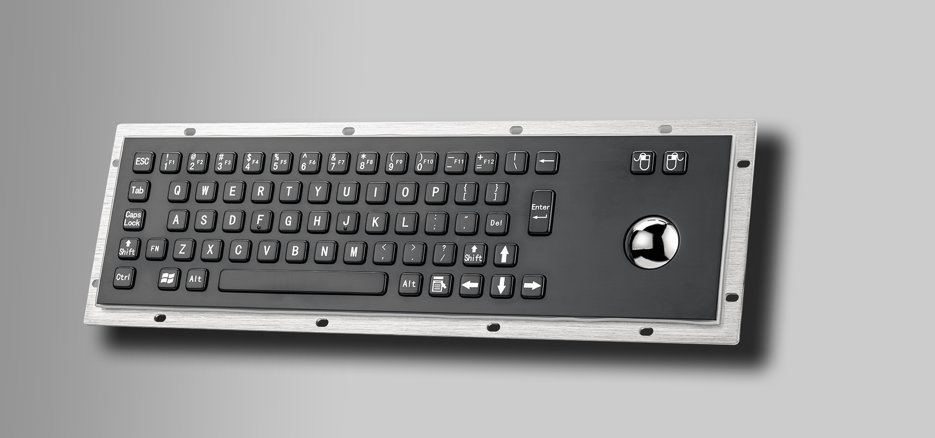 IP54嵌入式带轨迹球工业键盘,上嵌入式安装方式67键紧凑布局,轨迹球直径38mm,300转/min可进行精准快速光标定位,如F1-F12功能键需+FN组合键使用,内置电路采用工业级标准沉金PCB板。