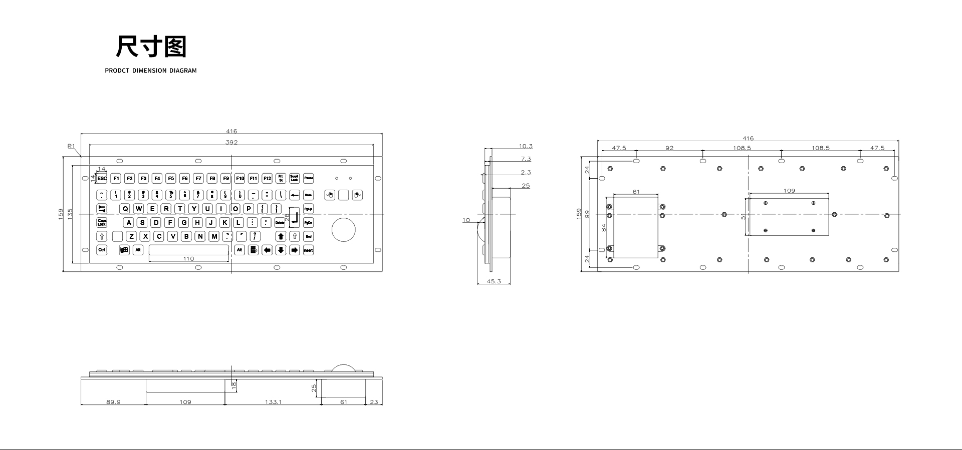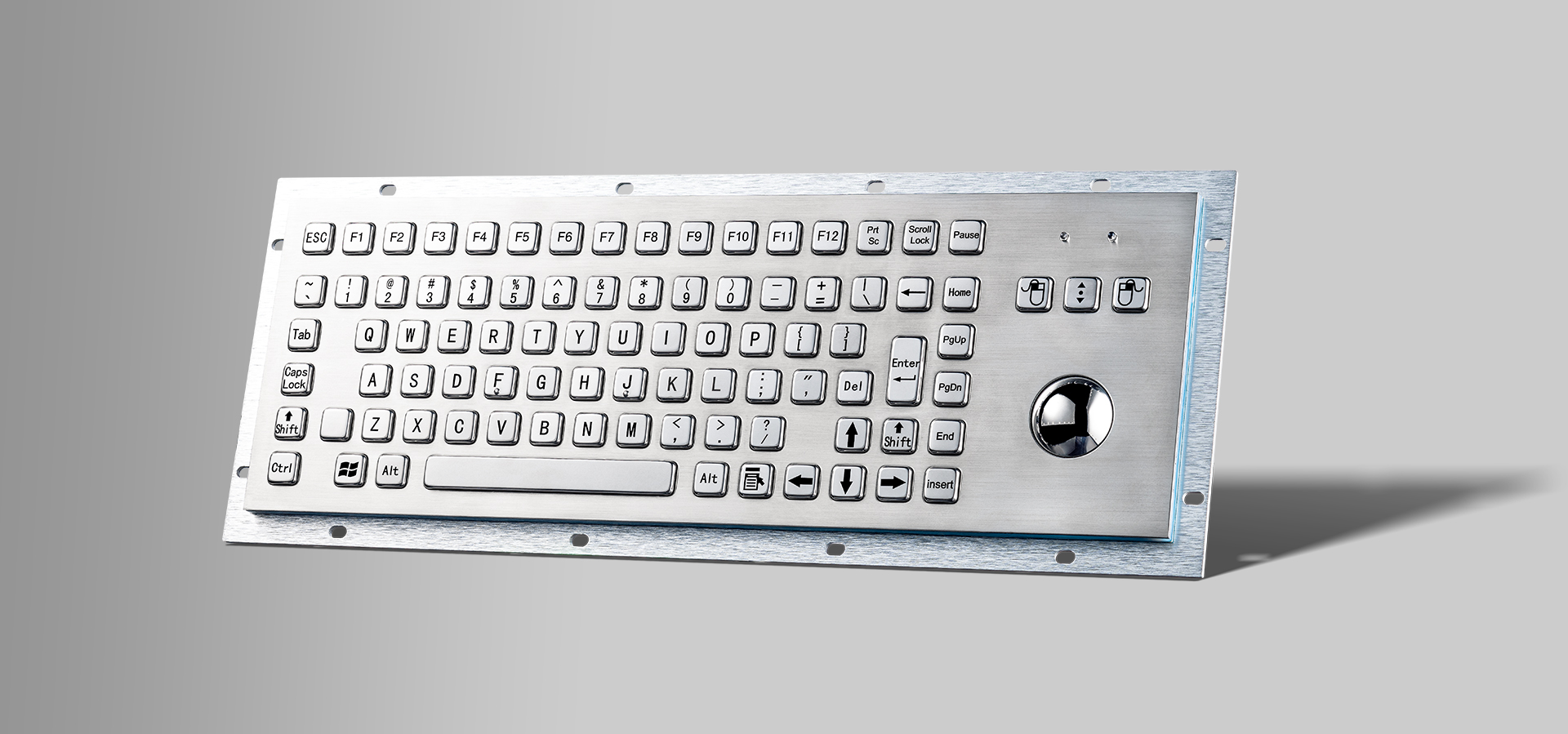 IP54嵌入式带轨迹球工业键盘,上嵌入式安装方式106键布局,轨迹球直径38mm,300转/min可进行精准快速光标定位,采用单独F1-F12功能键设计,内置电路采用工业级标准沉金PCB板。
